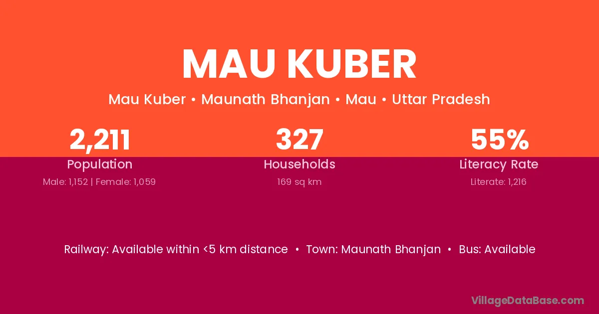 Mau Kuber village has a total population of 2,211 people, of which 1,152 are males and 1,059 are females.
