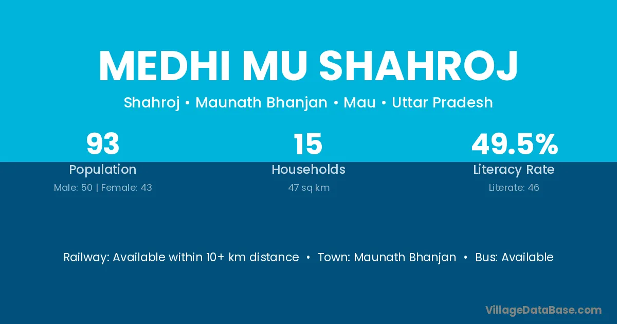 Medhi Mu Shahroj village has a total population of 93 people, of which 50 are males and 43 are females.