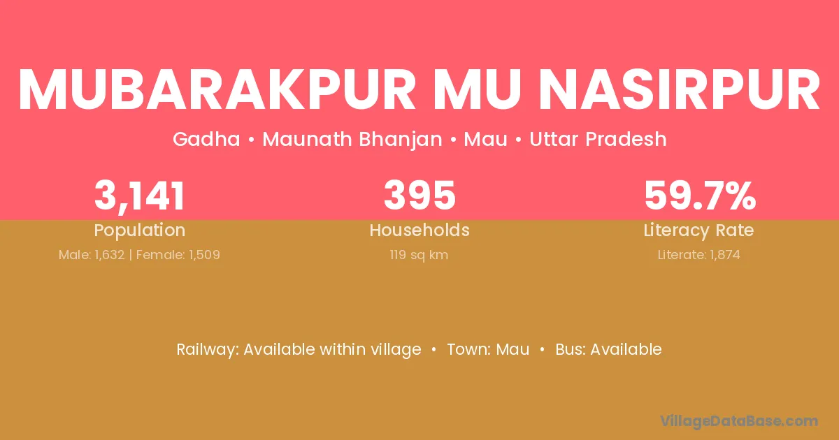 Mubarakpur Mu Nasirpur village has a total population of 3,141 people, of which 1,632 are males and 1,509 are females.