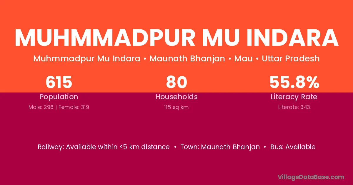 Muhmmadpur Mu Indara village has a total population of 615 people, of which 296 are males and 319 are females.