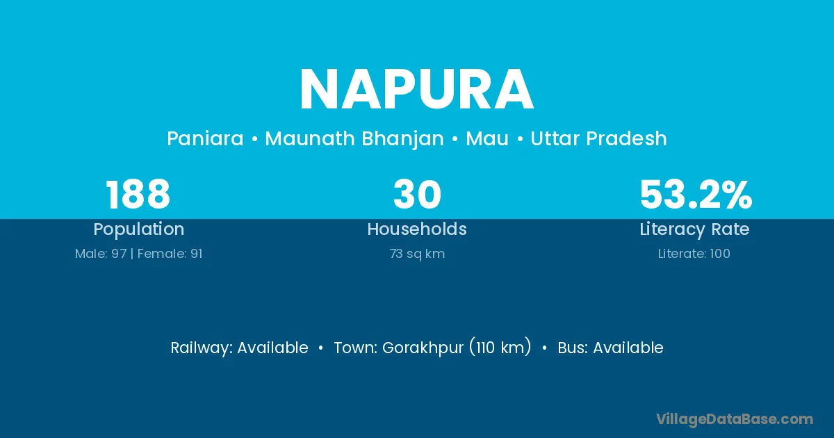 Gorakhpur (110 km) is the nearest town to Napura village for major economic activities and is located approximately 110 km away.