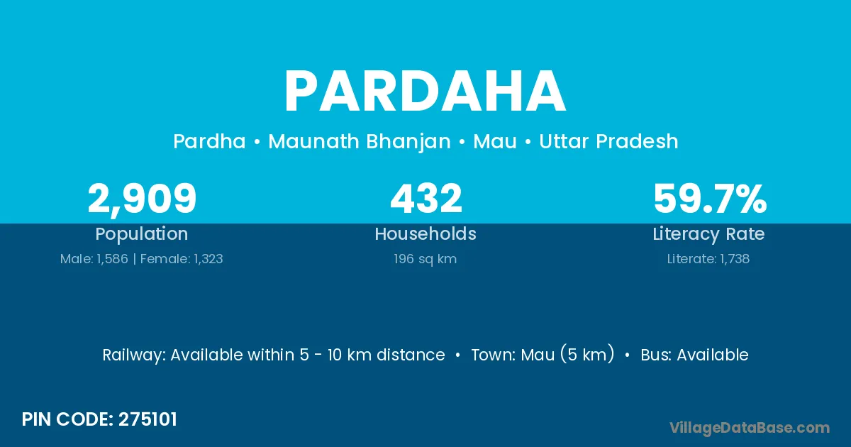 Mau (5 km) is the nearest town to Pardaha village for major economic activities and is located approximately 5 km away.