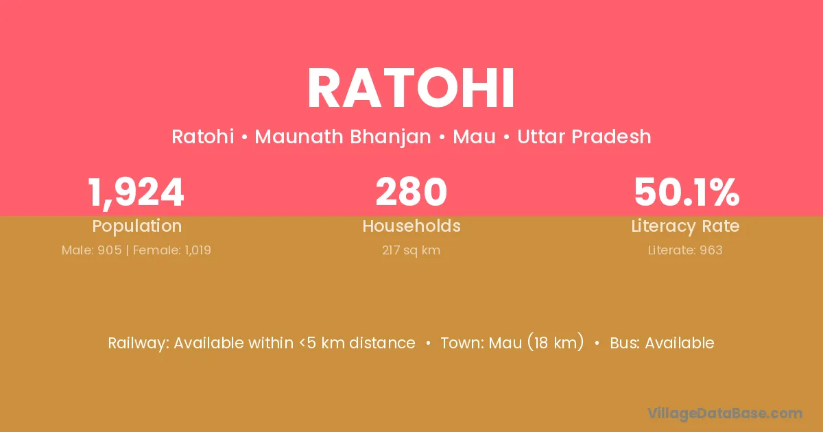 Mau (18 km) is the nearest town to Ratohi village for major economic activities and is located approximately 18 km away.