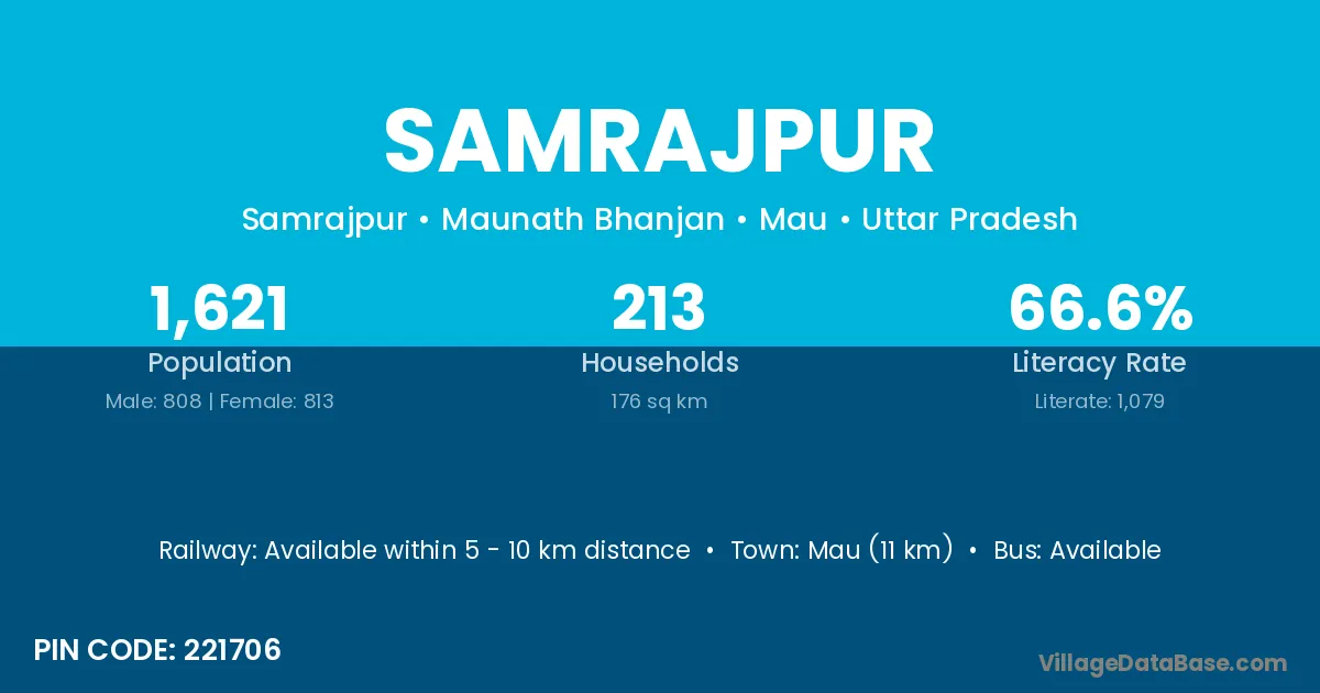 Mau (11 km) is the nearest town to Samrajpur village for major economic activities and is located approximately 11 km away.