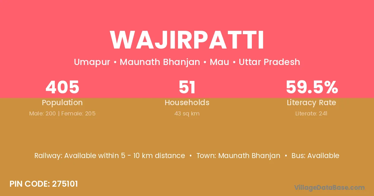 Wajirpatti village has a total population of 405 people, of which 200 are males and 205 are females.