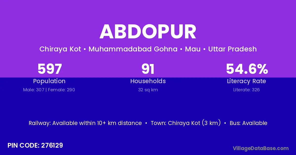 Chiraya Kot (3 km) is the nearest town to Abdopur village for major economic activities and is located approximately 3 km away.