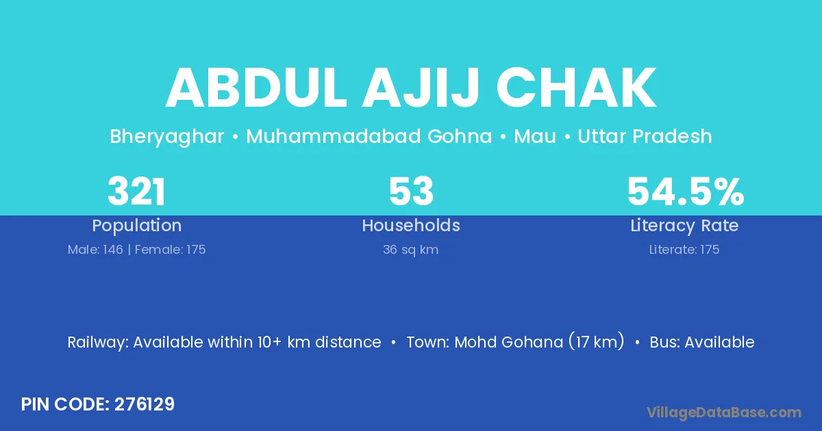 Mohd Gohana (17 km) is the nearest town to Abdul Ajij Chak village for major economic activities and is located approximately 17 km away.