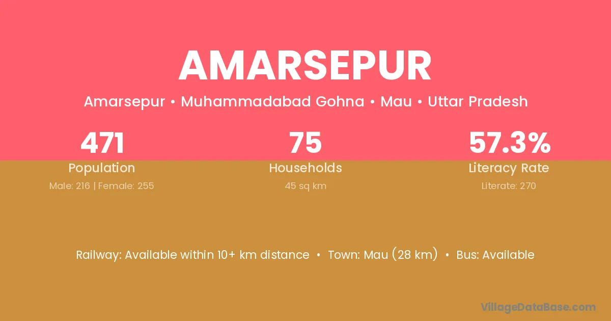 Mau (28 km) is the nearest town to Amarsepur village for major economic activities and is located approximately 28 km away.