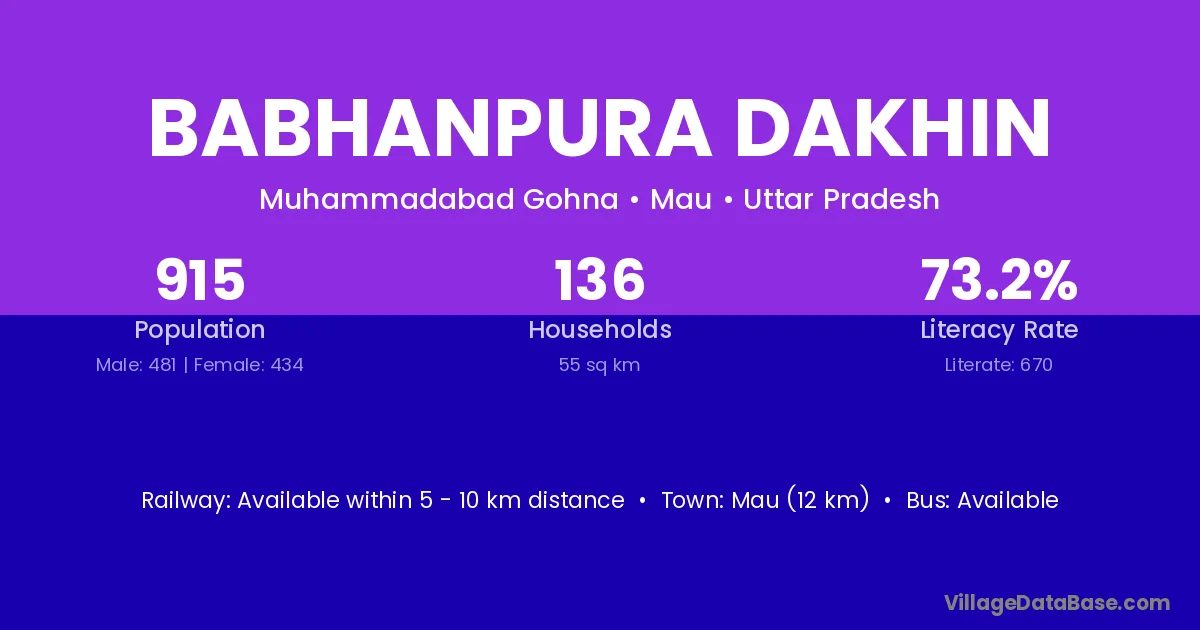 Babhanpura Dakhin village has a total population of 915 people, of which 481 are males and 434 are females.