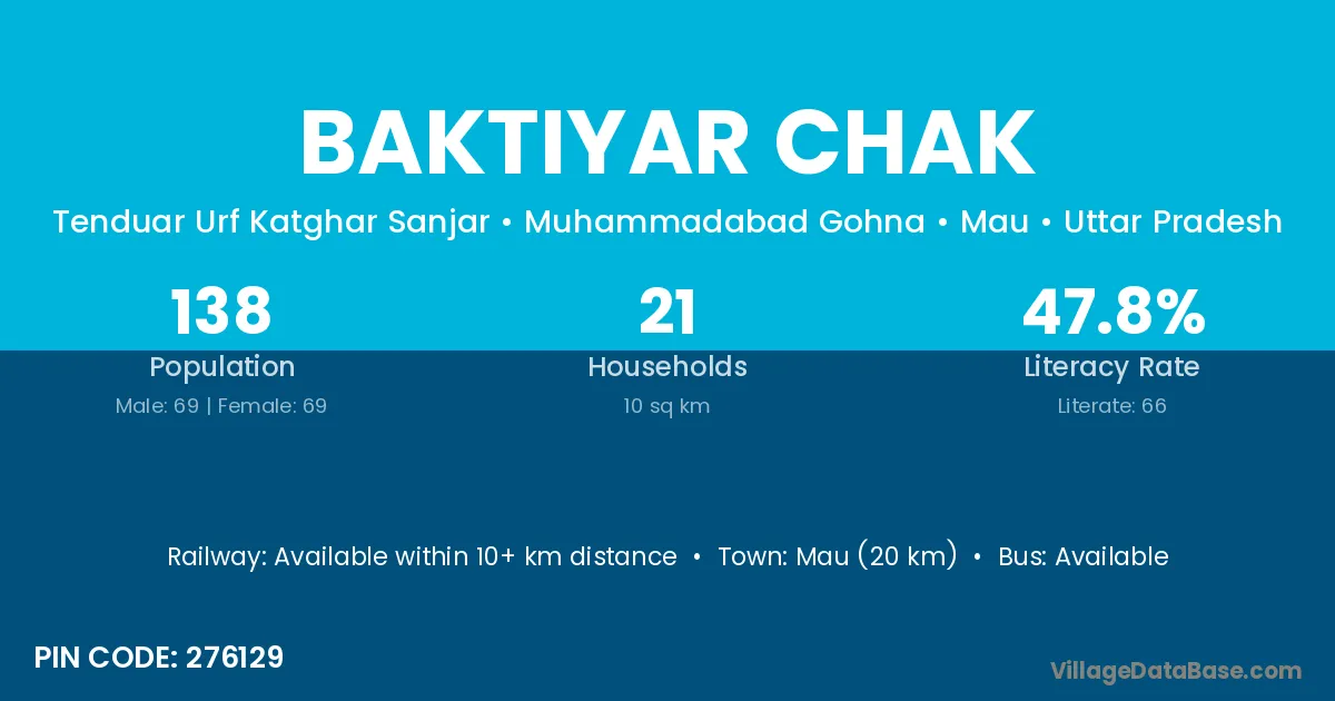 Mau (20 km) is the nearest town to Baktiyar Chak village for major economic activities and is located approximately 20 km away.
