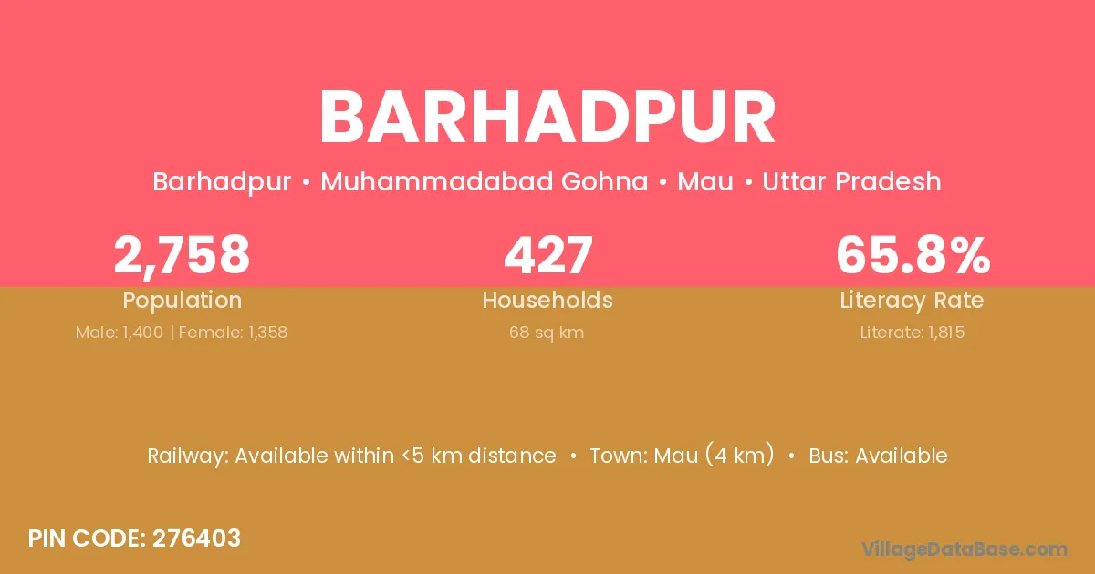 Mau (4 km) is the nearest town to Barhadpur village for major economic activities and is located approximately 4 km away.