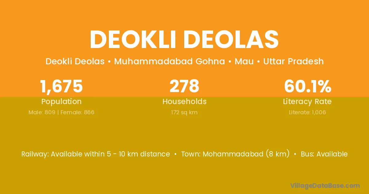 Mohammadabad (8 km) is the nearest town to Deokli Deolas village for major economic activities and is located approximately 8 km away.