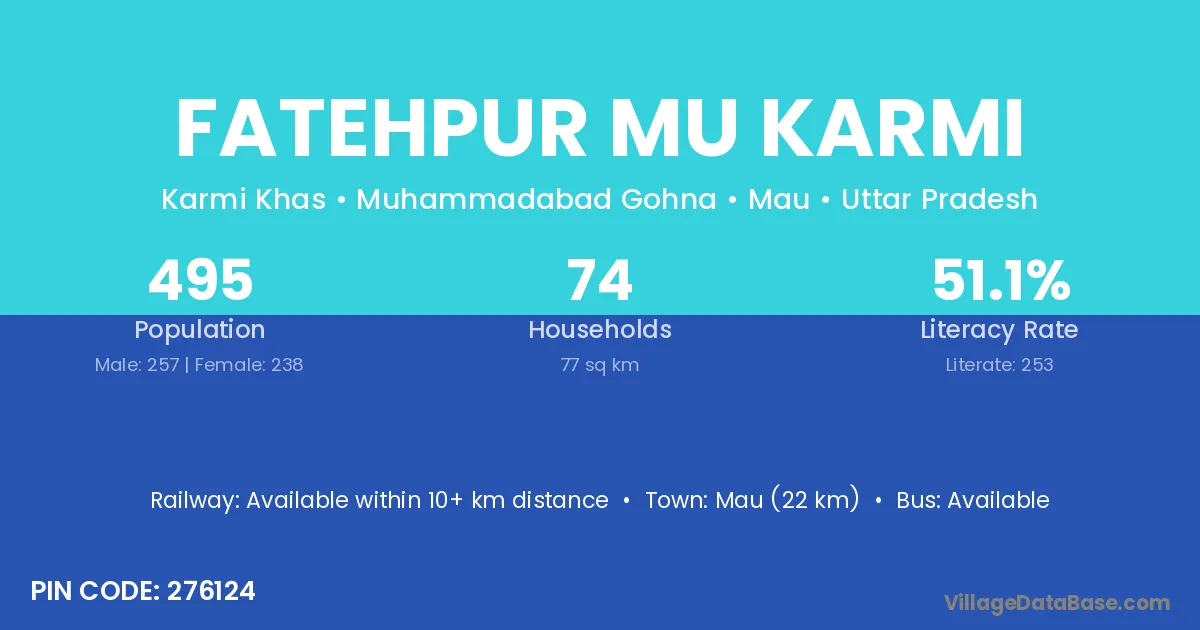 Mau (22 km) is the nearest town to Fatehpur Mu Karmi village for major economic activities and is located approximately 22 km away.