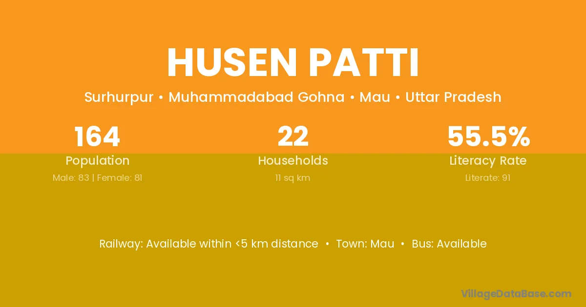 Husen Patti village has a total population of 164 people, of which 83 are males and 81 are females.