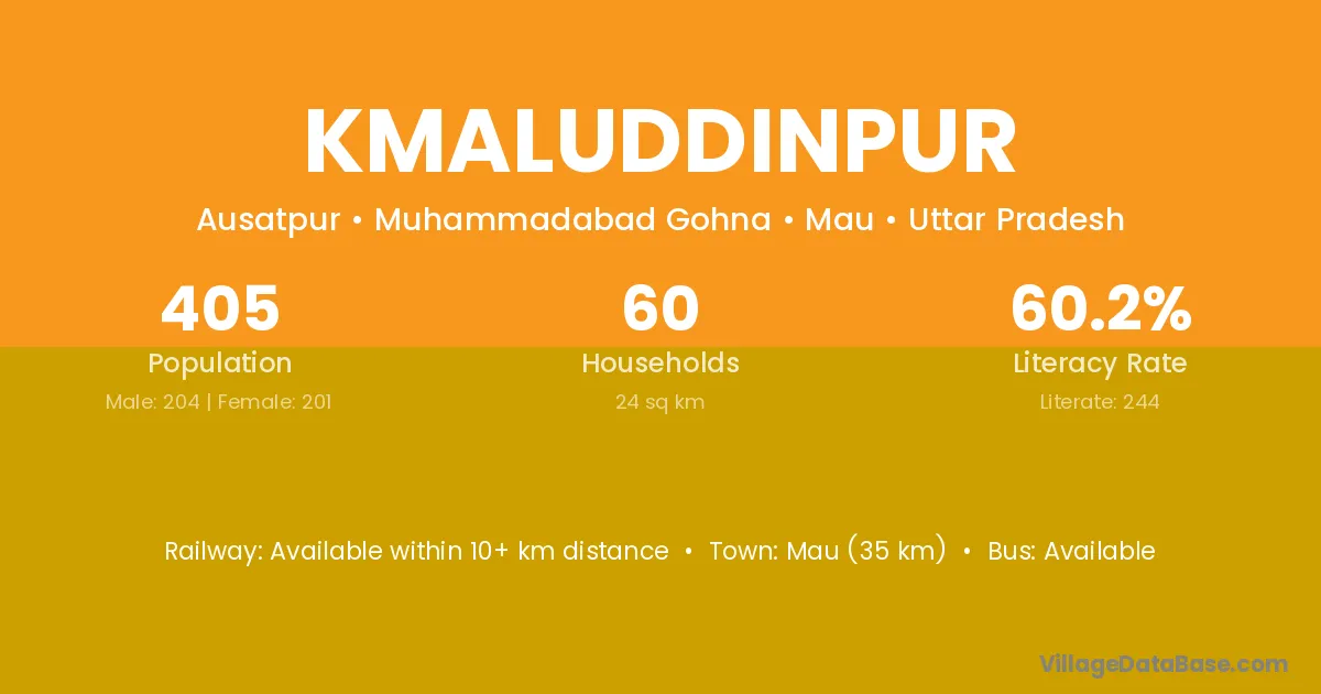 Mau (35 km) is the nearest town to Kmaluddinpur village for major economic activities and is located approximately 35 km away.