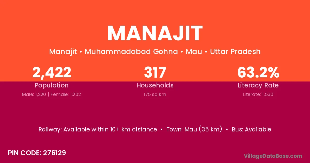 Mau (35 km) is the nearest town to Manajit village for major economic activities and is located approximately 35 km away.
