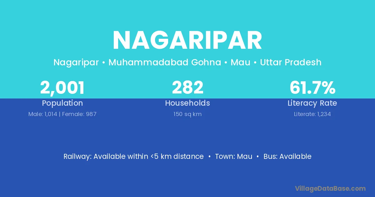 Nagaripar village has a total population of 2,001 people, of which 1,014 are males and 987 are females.