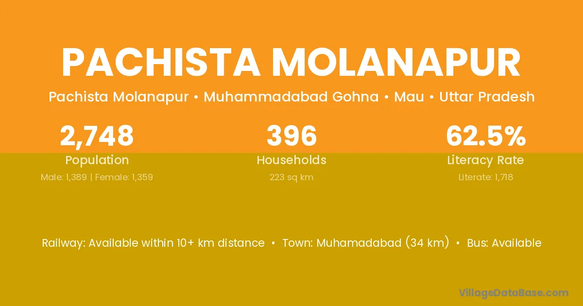 Muhamadabad (34 km) is the nearest town to Pachista Molanapur village for major economic activities and is located approximately 34 km away.