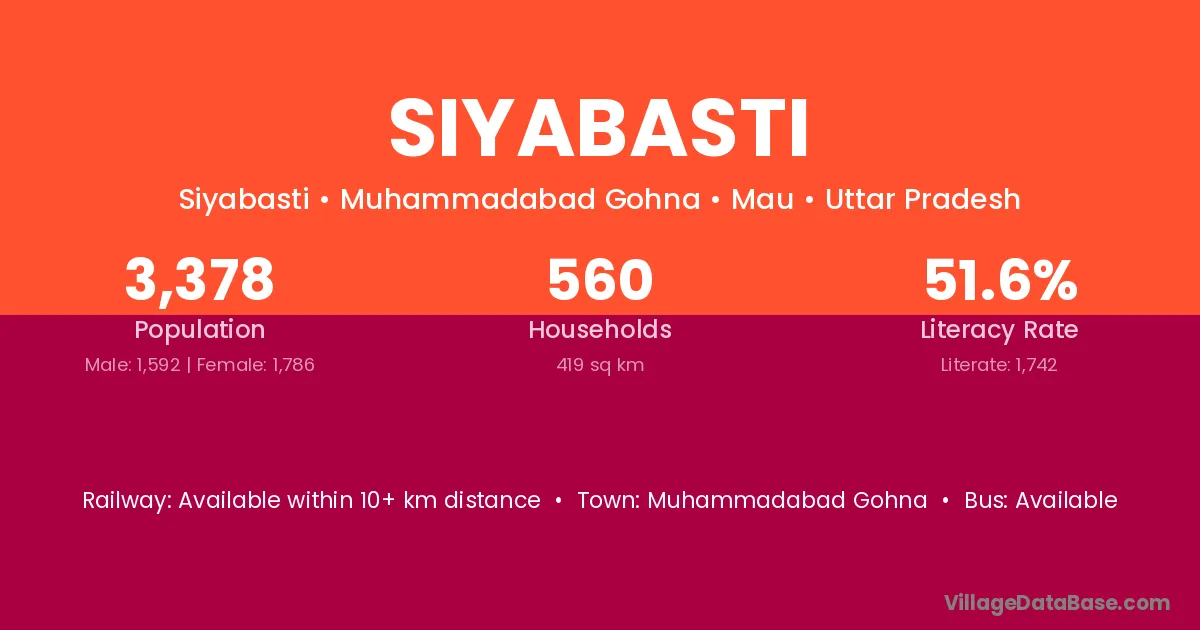 Siyabasti village has a total population of 3,378 people, of which 1,592 are males and 1,786 are females.