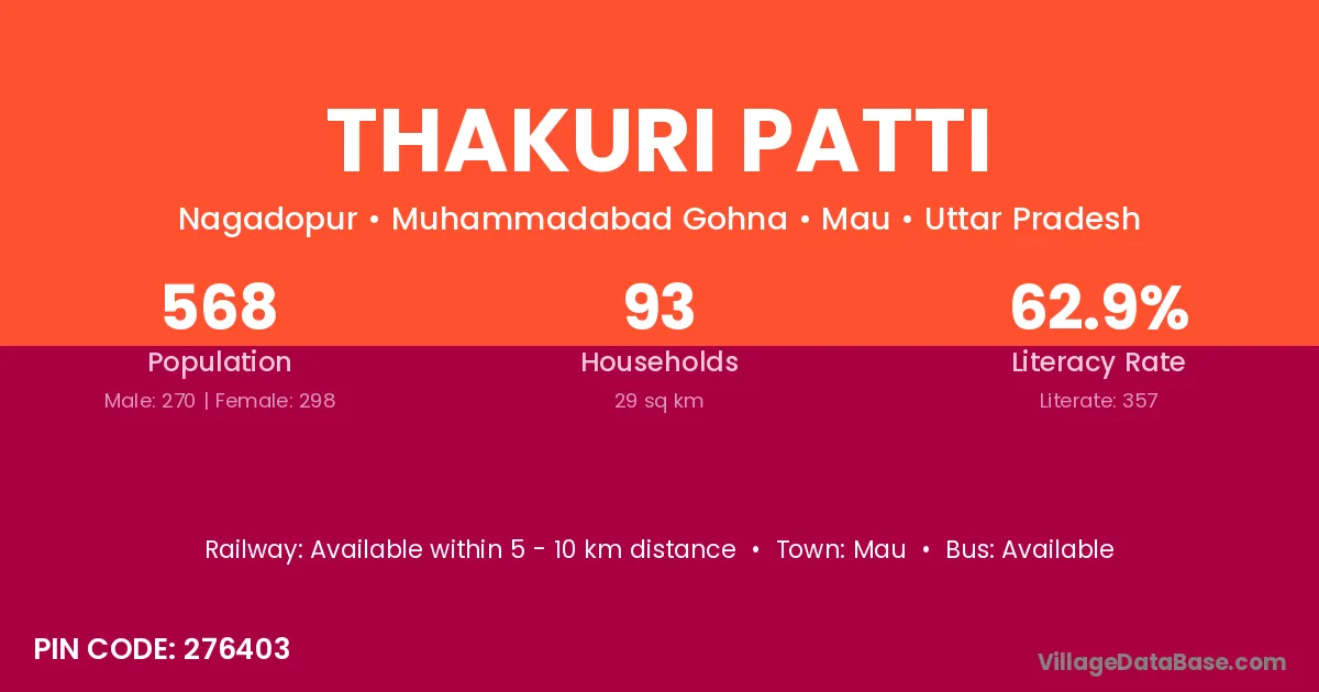 Thakuri Patti village has a total population of 568 people, of which 270 are males and 298 are females.