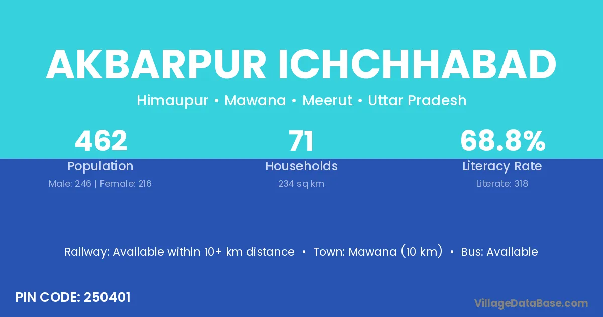 Mawana (10 km) is the nearest town to Akbarpur Ichchhabad village for major economic activities and is located approximately 10 km away.