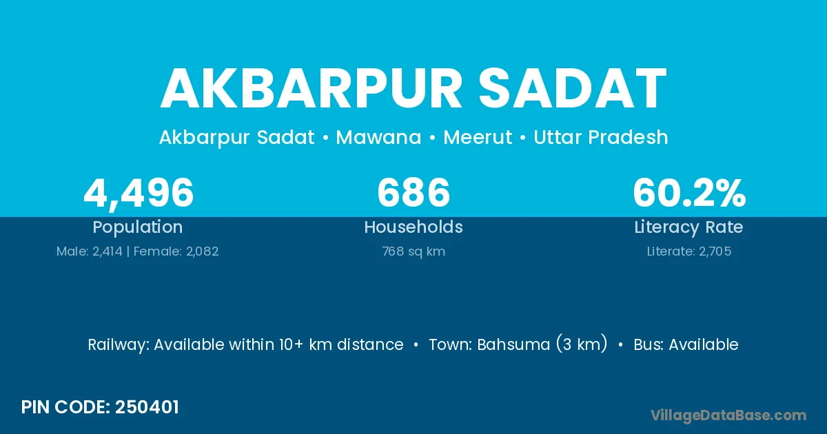 Akbarpur Sadat village has a total population of 4,496 people, of which 2,414 are males and 2,082 are females.