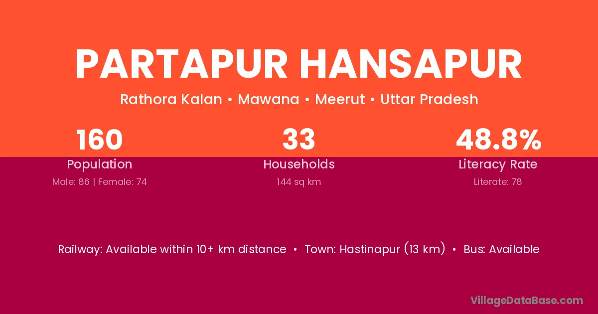Hastinapur (13 km) is the nearest town to Partapur Hansapur village for major economic activities and is located approximately 13 km away.