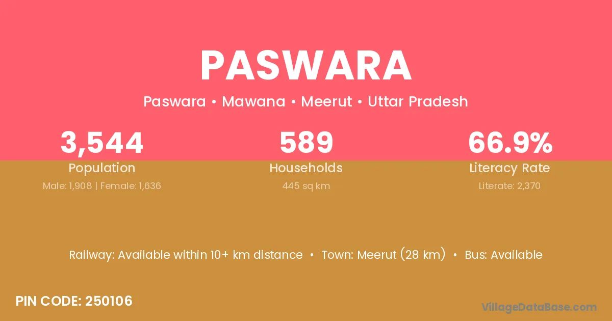 Meerut (28 km) is the nearest town to Paswara village for major economic activities and is located approximately 28 km away.