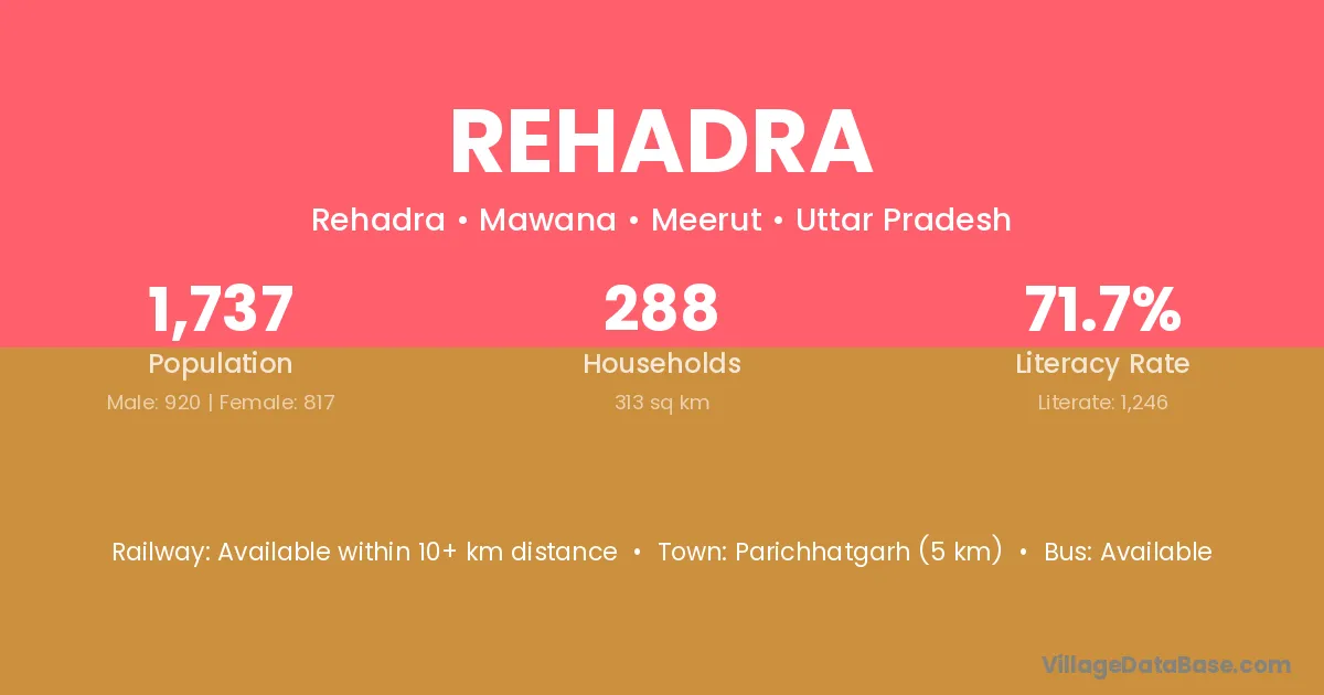 Rehadra village has a total population of 1,737 people, of which 920 are males and 817 are females.
