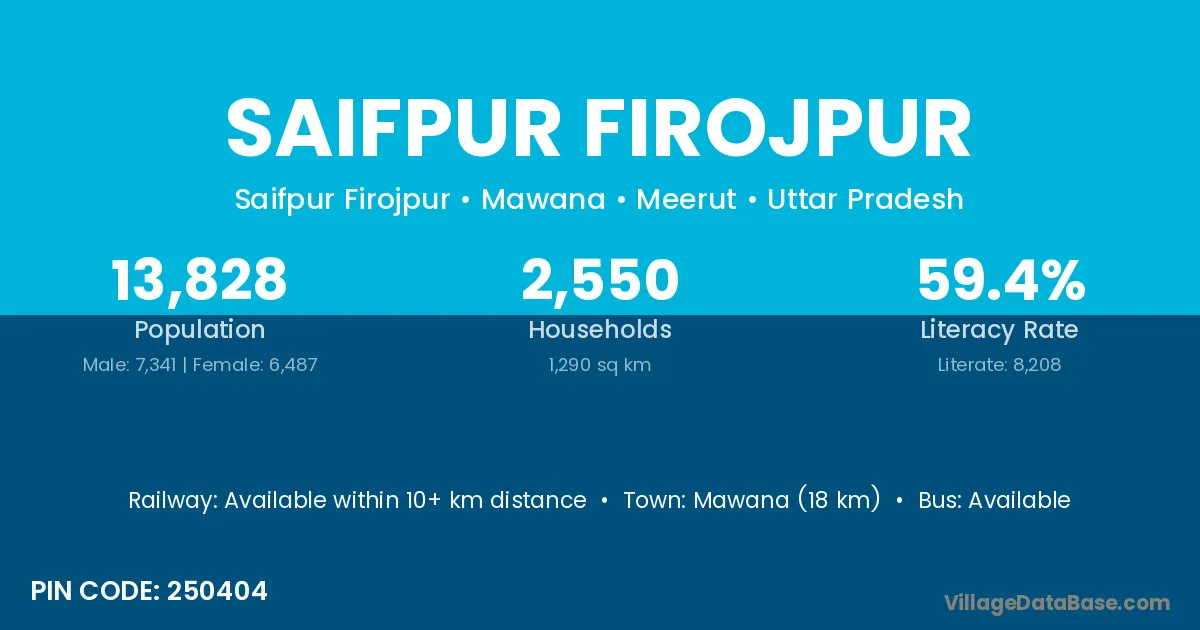 Mawana (18 km) is the nearest town to Saifpur Firojpur village for major economic activities and is located approximately 18 km away.