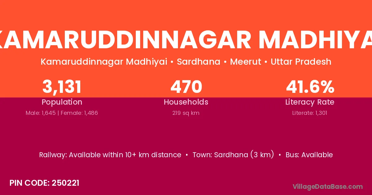Sardhana (3 km) is the nearest town to Kamaruddinnagar Madhiyai village for major economic activities and is located approximately 3 km away.
