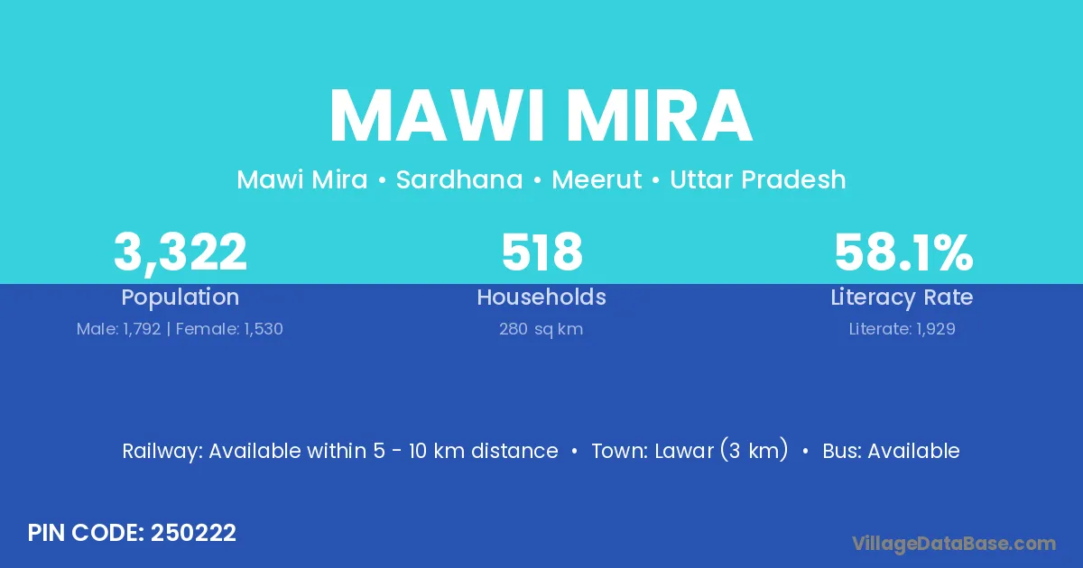Lawar (3 km) is the nearest town to Mawi Mira village for major economic activities and is located approximately 3 km away.