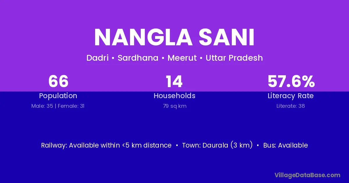 Daurala (3 km) is the nearest town to Nangla Sani village for major economic activities and is located approximately 3 km away.