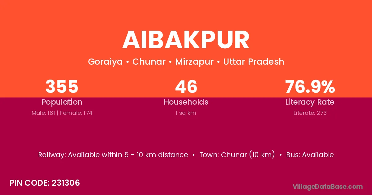 Chunar (10 km) is the nearest town to Aibakpur village for major economic activities and is located approximately 10 km away.