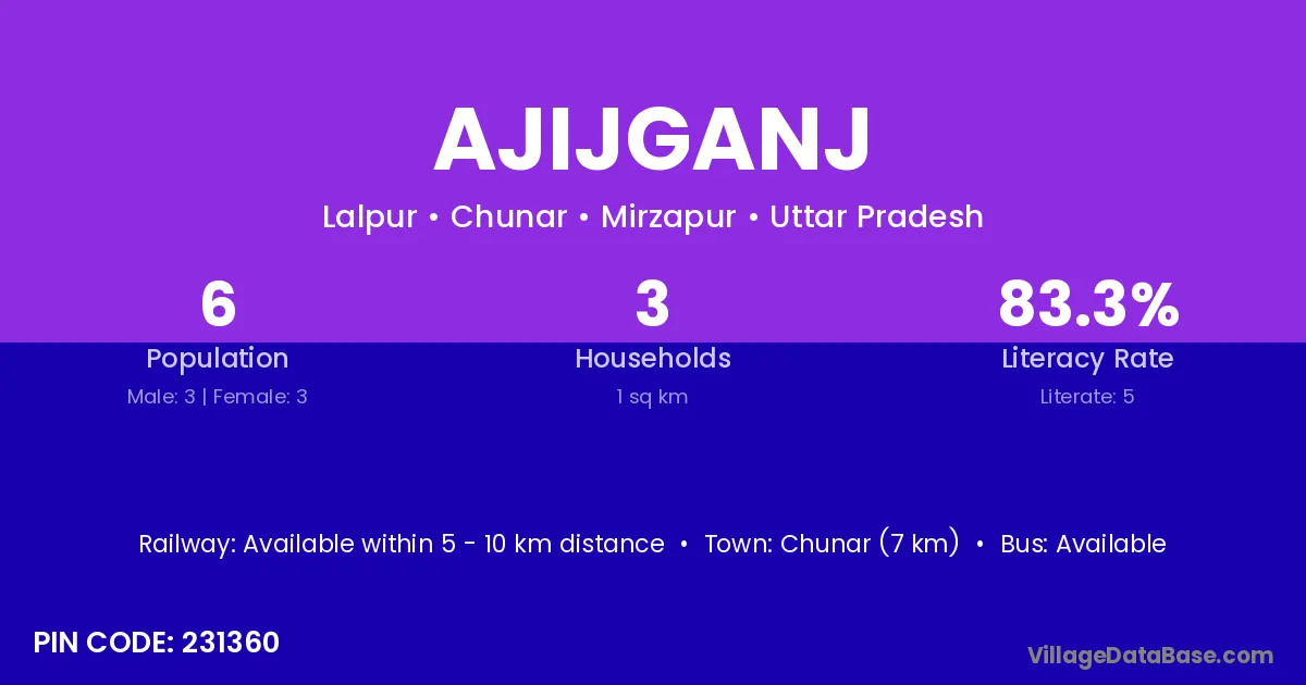 Chunar (7 km) is the nearest town to Ajijganj village for major economic activities and is located approximately 7 km away.