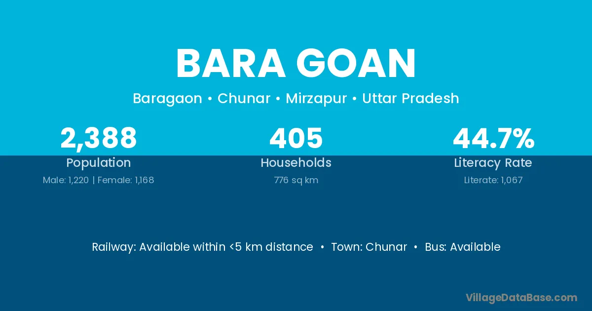 Bara Goan village has a total population of 2,388 people, of which 1,220 are males and 1,168 are females.