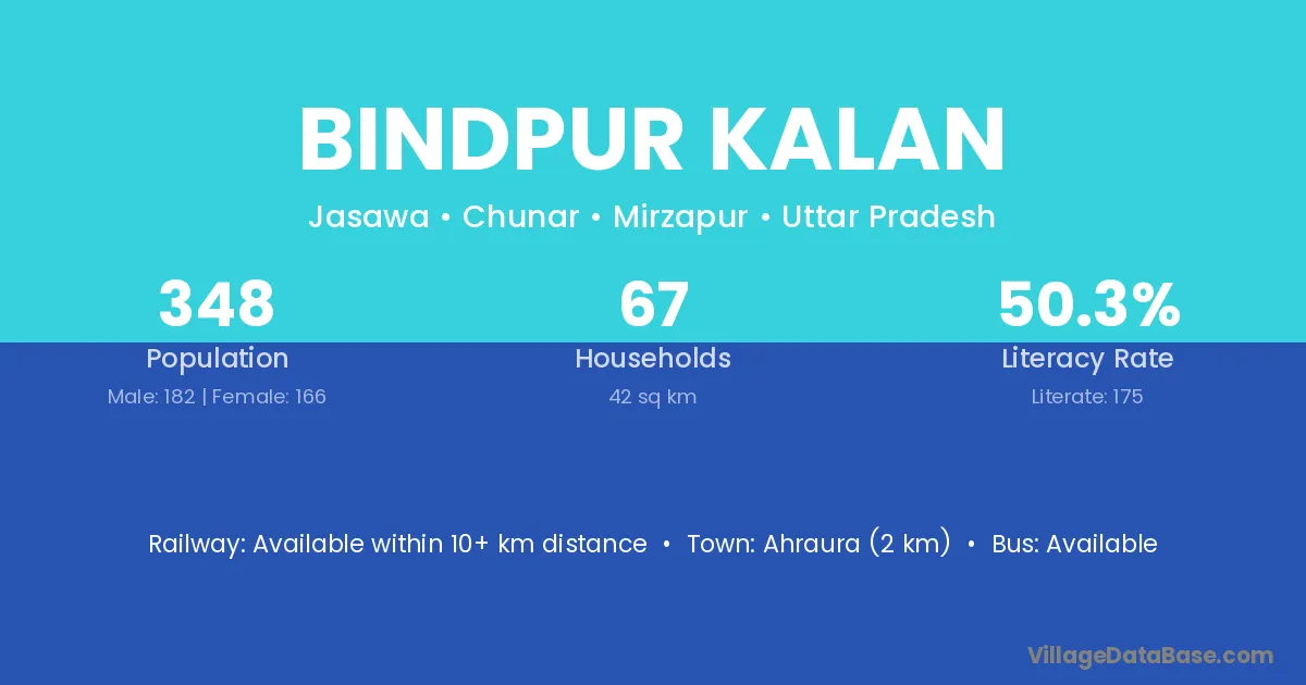 Ahraura (2 km) is the nearest town to Bindpur Kalan village for major economic activities and is located approximately 2 km away.