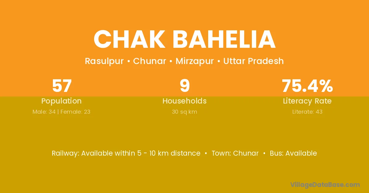 Chak Bahelia village has a total population of 57 people, of which 34 are males and 23 are females.