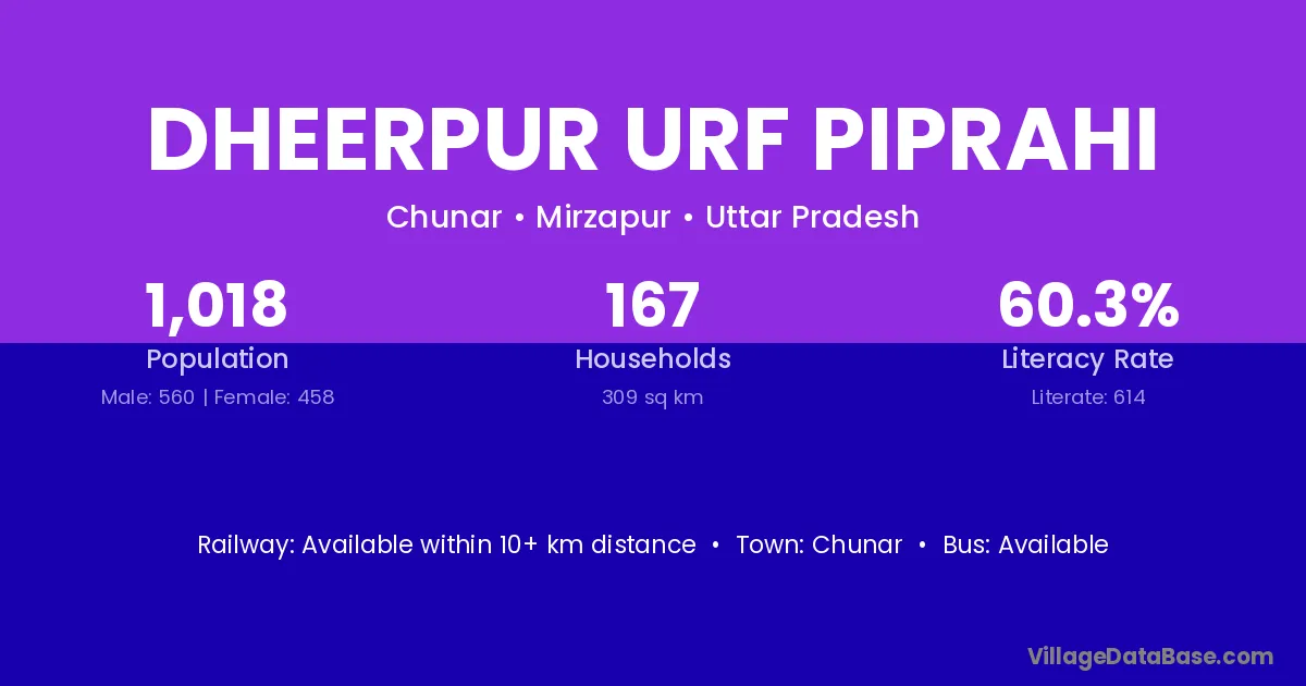 Dheerpur Urf Piprahi village has a total population of 1,018 people, of which 560 are males and 458 are females.