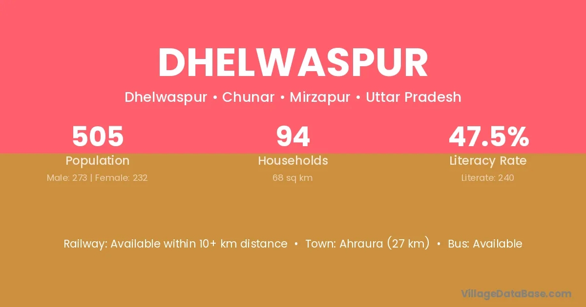 Ahraura (27 km) is the nearest town to Dhelwaspur village for major economic activities and is located approximately 27 km away.