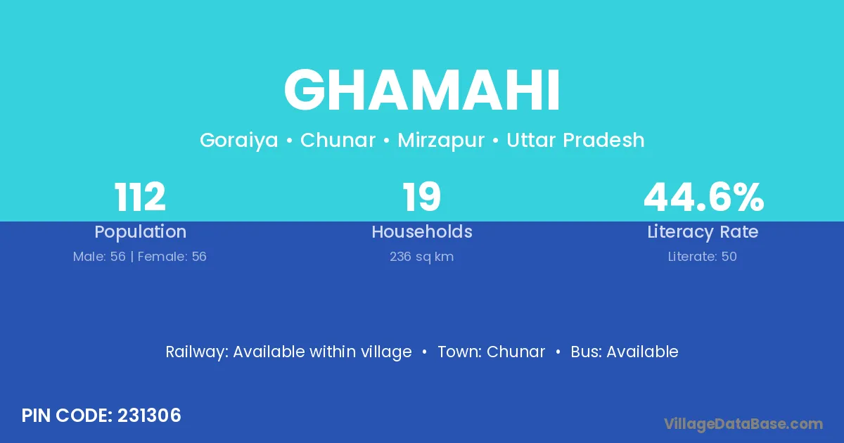 Ghamahi village has a total population of 112 people, of which 56 are males and 56 are females.