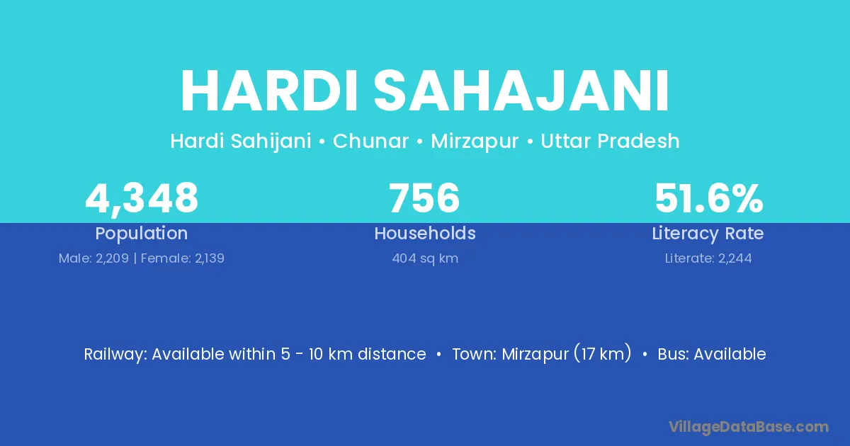 Mirzapur (17 km) is the nearest town to Hardi Sahajani village for major economic activities and is located approximately 17 km away.