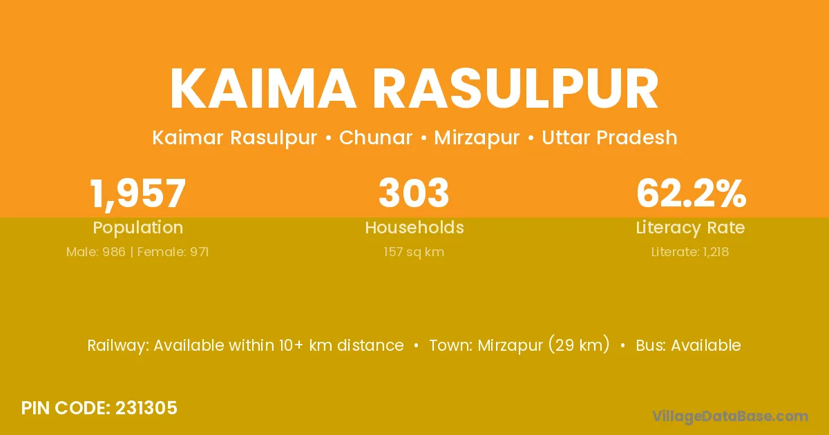 Mirzapur (29 km) is the nearest town to Kaima Rasulpur village for major economic activities and is located approximately 29 km away.