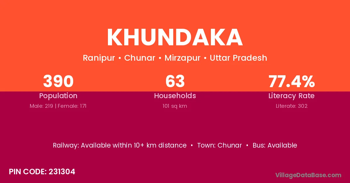Khundaka village has a total population of 390 people, of which 219 are males and 171 are females.