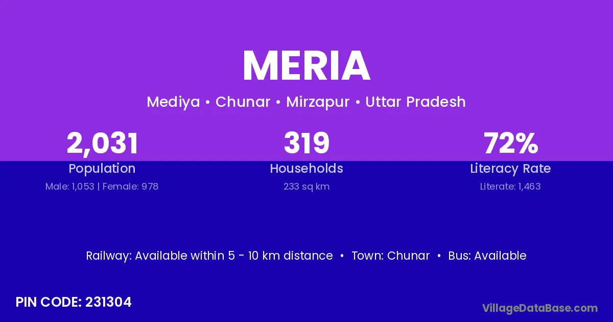 Meria village has a total population of 2,031 people, of which 1,053 are males and 978 are females.