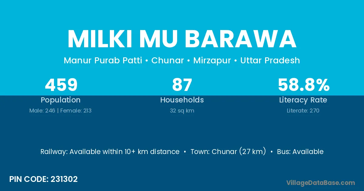 Chunar (27 km) is the nearest town to Milki Mu Barawa village for major economic activities and is located approximately 27 km away.