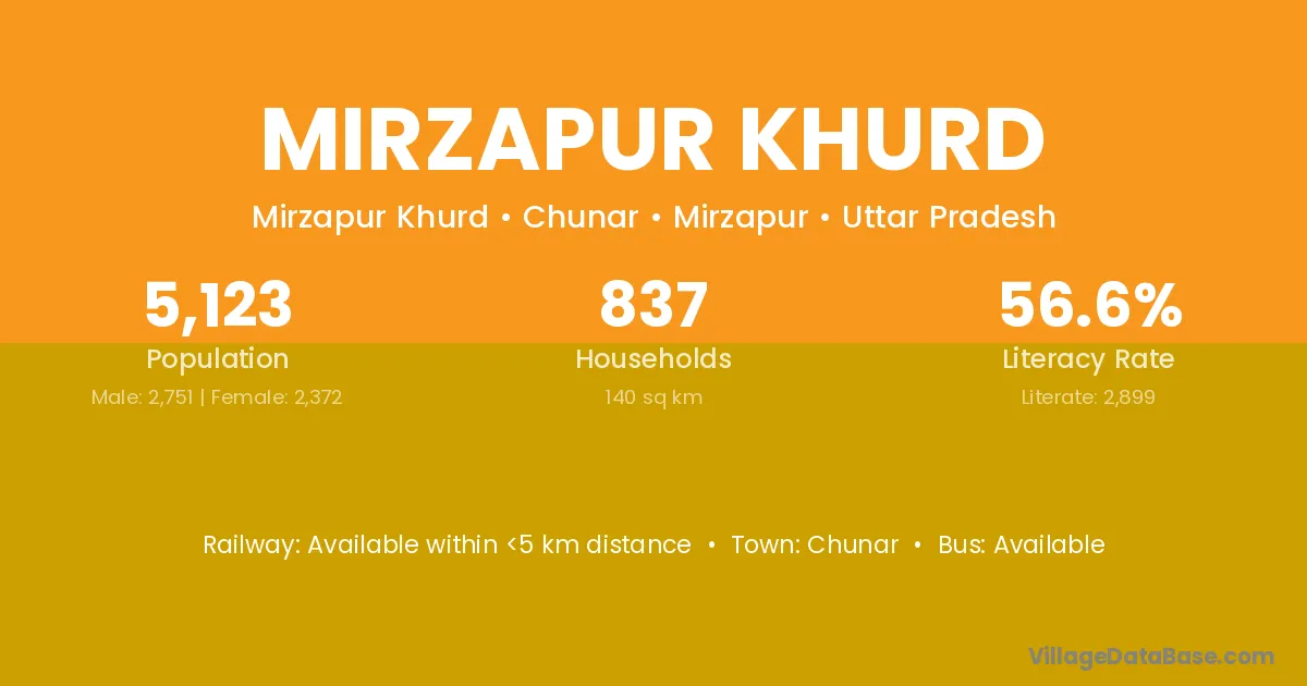 Mirzapur Khurd village has a total population of 5,123 people, of which 2,751 are males and 2,372 are females.