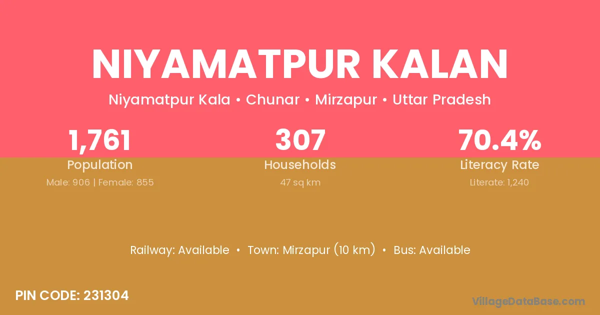 Mirzapur (10 km) is the nearest town to Niyamatpur Kalan village for major economic activities and is located approximately 10 km away.