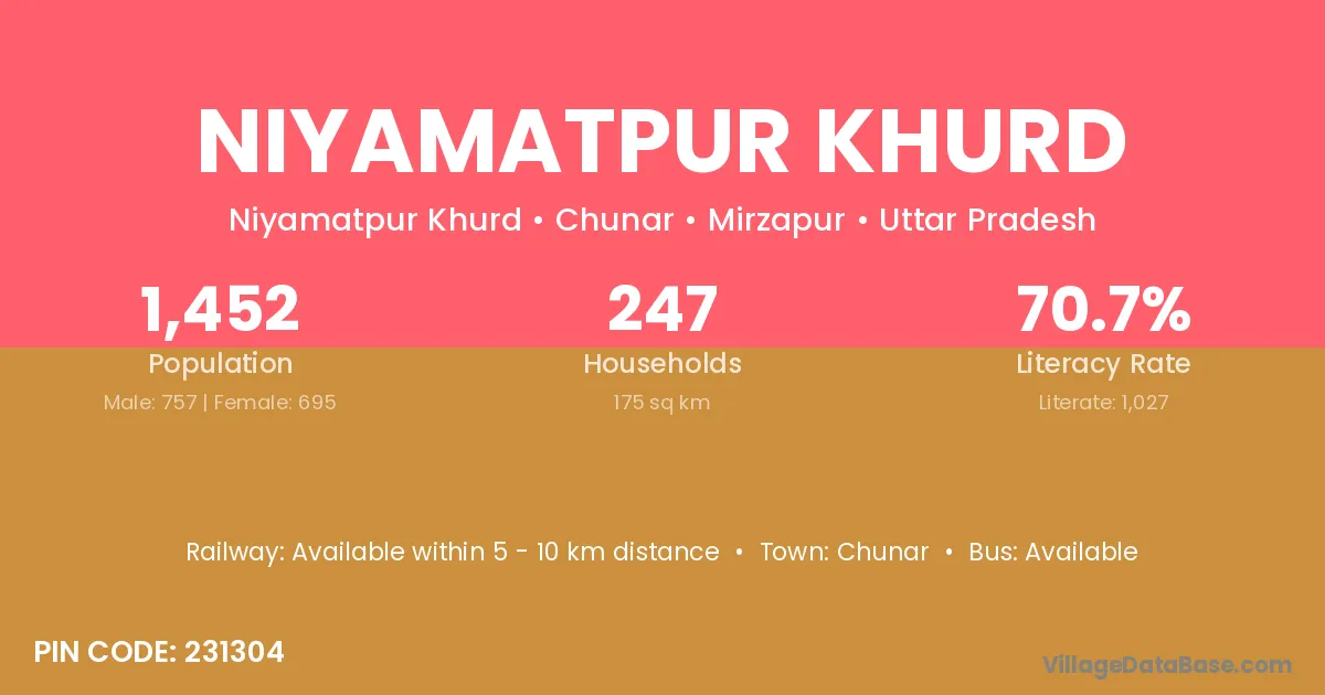 Chunar is the nearest town to Niyamatpur Khurd village for major economic activities