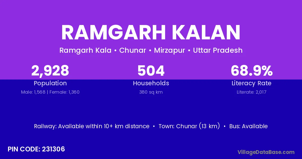 Chunar (13 km) is the nearest town to Ramgarh Kalan village for major economic activities and is located approximately 13 km away.